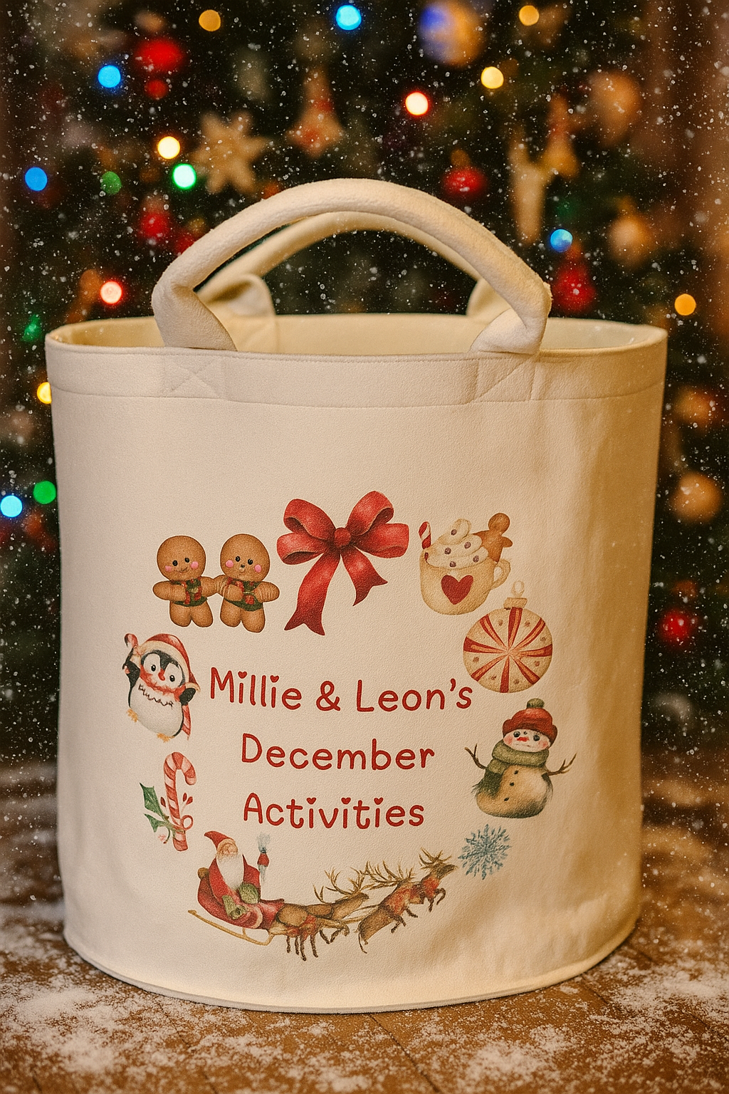 our beautifully crafted Christmas trugs offer 9 unique designs and two size options. These versatile trugs can be personalised with your chosen wording, making them ideal for gifts, storing festive treats, toys, blankets, and more. The small size measures approximately 30x30cm, while the medium is about 40x40cm. Select your preferred design and size from the dropdown menus, and enter your custom text in the provided box. Please note, only the text you provide will be printed—no default wording included.