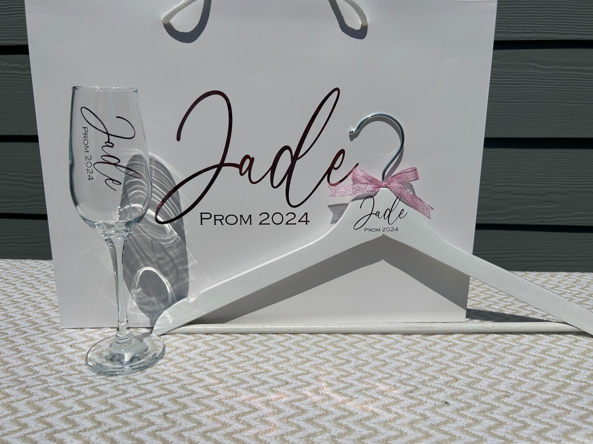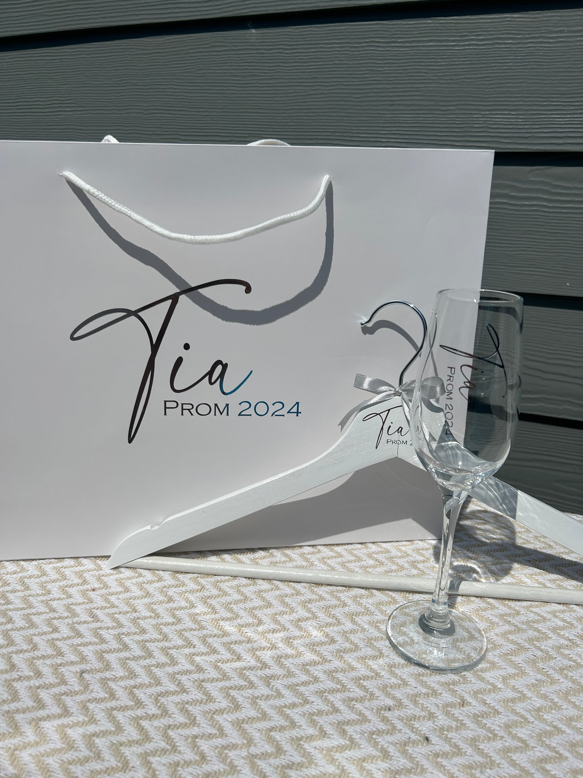 Beautiful personalised dress hanger, champagne flute and Gift Bag