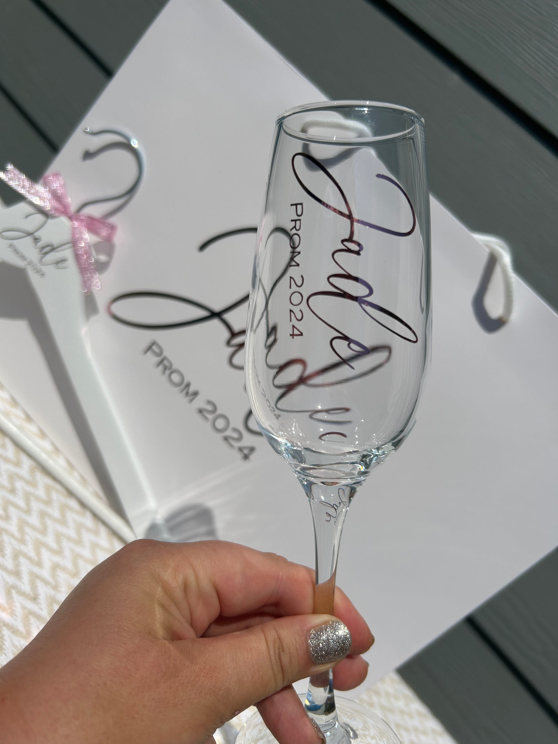 Standard size champagne flute, decorated in your choice of wording, and finished off with a matching or contrasting bow.